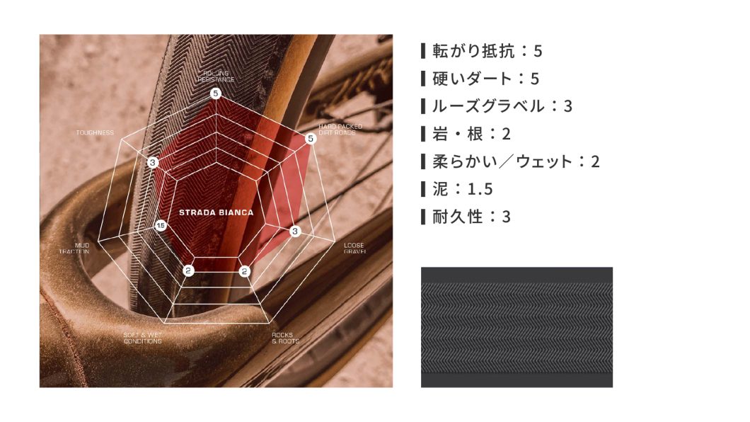 路面がスムーズで速く、乾いている状況ではStrada Biancaが最適です。舗装路主体で、途中に硬く締まったグラベルやダートが混ざるようなライドに向いています。転がり抵抗が低く反応の良い乗り味で、ロードバイクに太めのタイヤを装着して日常的に走る用途にも適しています。