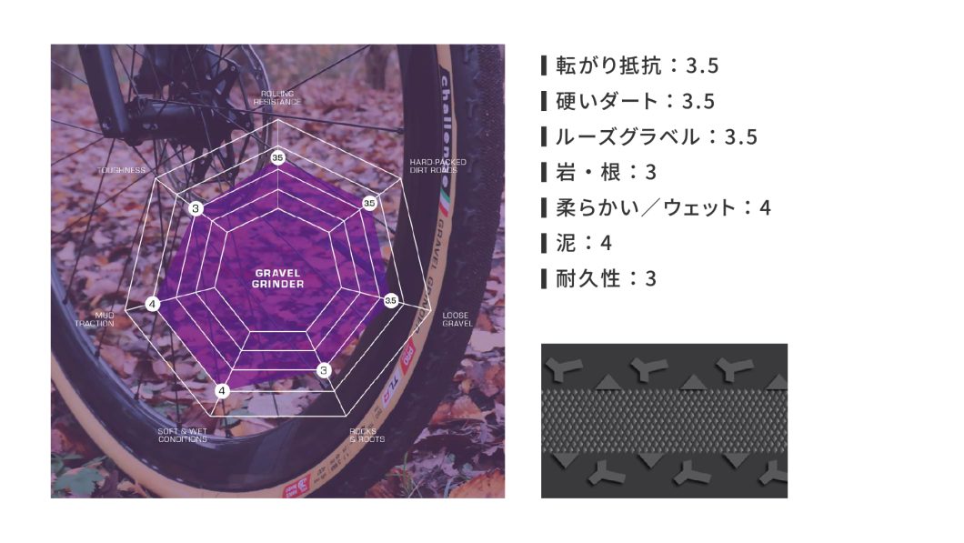さまざまな路面を楽しむライダーに最適なタイヤです。密集したノブパターンにより転がり抵抗が低く、乾いた砂利のコーナーでもベルクロのようなグリップを発揮します。乾いたコンディションから、やや湿ったコンディションまで幅広く対応し、トレッドがしっかり路面を捉えられる環境で特に優れた性能を発揮します。
