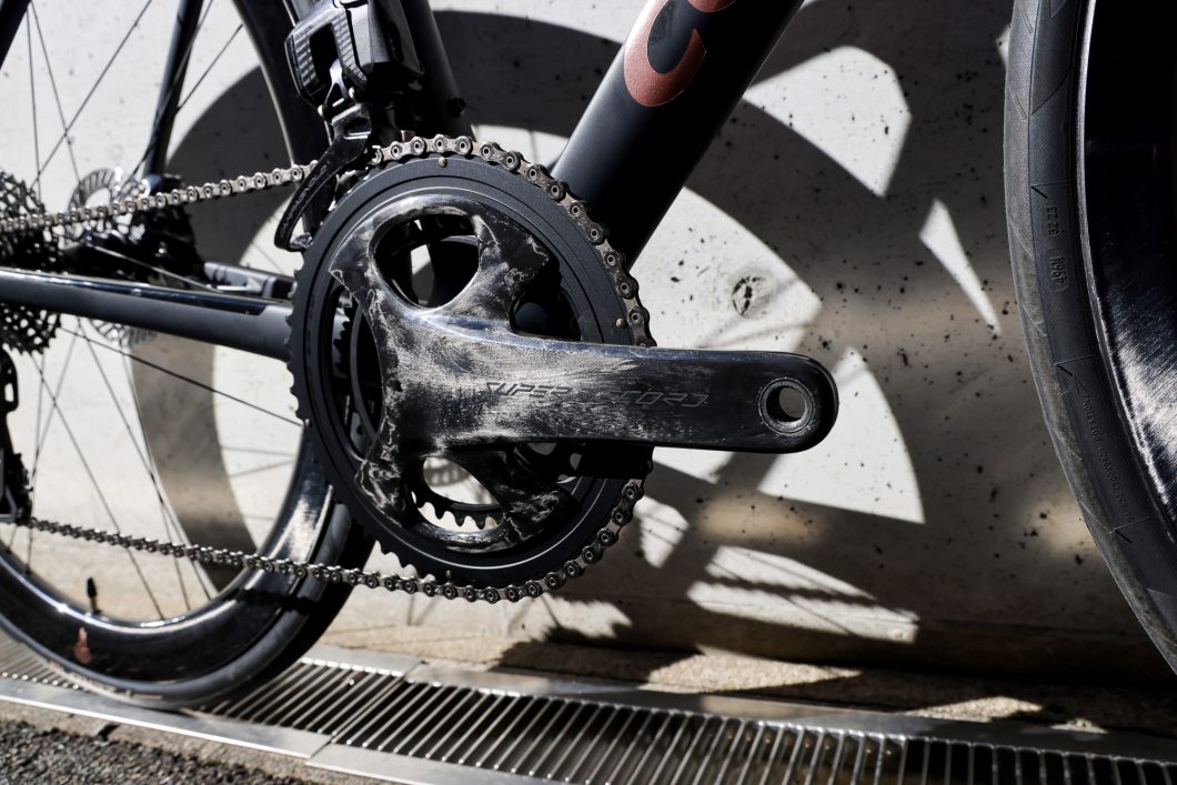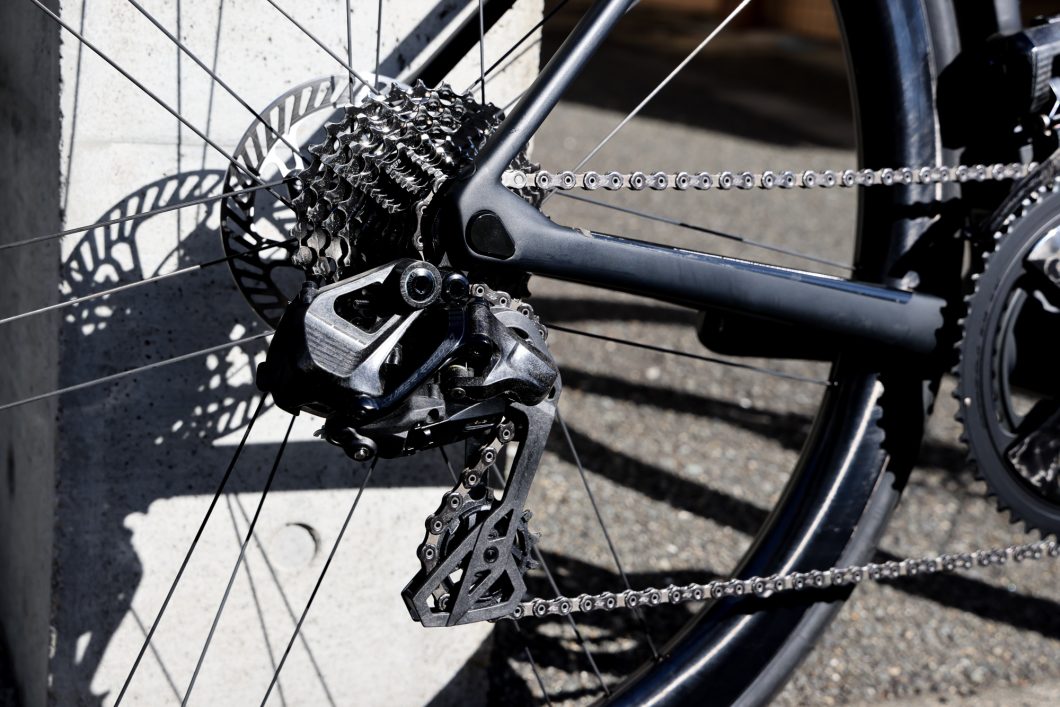 13速化によってギアレンジがより細かく最適化され、ケイデンスを乱すことなくスムーズに加速・減速できる点が大きな特長です。さらに、シフターがフルワイヤレス化された次世代の電動システムを採用しているため、ハンドル周りはクリーンに整理され、直感的でストレスのない操作感を得られます。新設計のクランクやリアディレイラー、カセットなどの刷新により、軽量化と高剛性の両立を実現し、より効率的なパワー伝達とキレのある走りをもたらすコンポーネントへと進化しました。