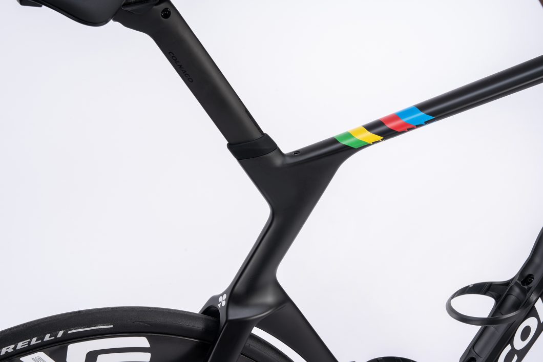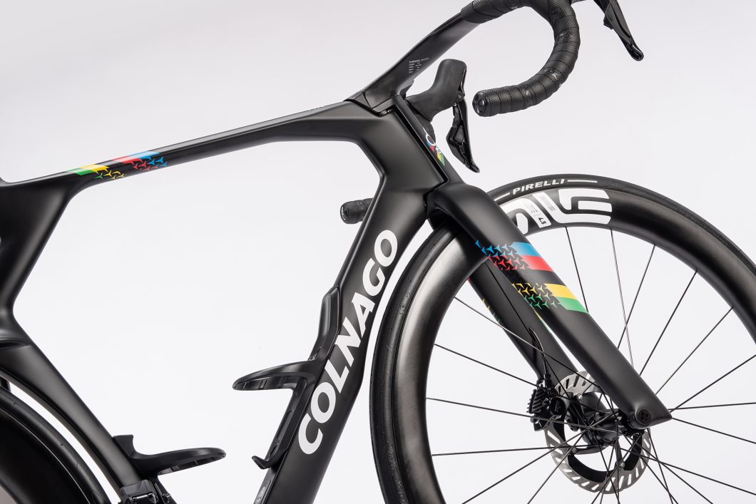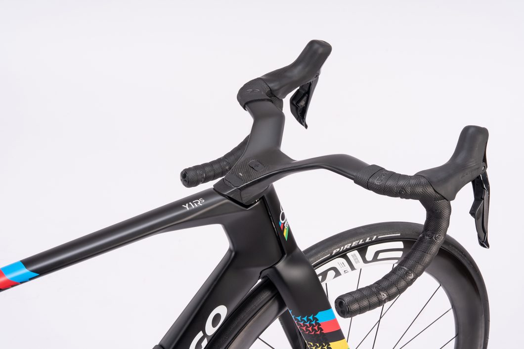 従来のロードバイクとはまったく異なる設計のフロントエリアには、コルナゴの歴史の中でも最高レベルの空力性能を誇るステム一体型ハンドルバー「CC.Y1」が採用され、同時にヘッドチューブもスリム化が施されている。