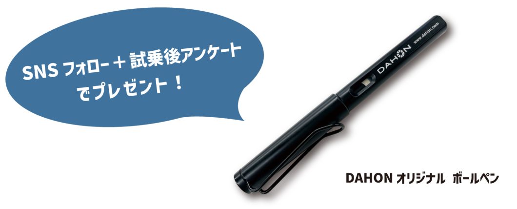 当日、Instagram / Facebook / X のいずれかのSNSでDAHONオフィシャルアカウントをフォローしている画面をご提示のうえ、試乗後アンケートへの回答でDAHONオリジナルボールペンをプレゼントいたします。