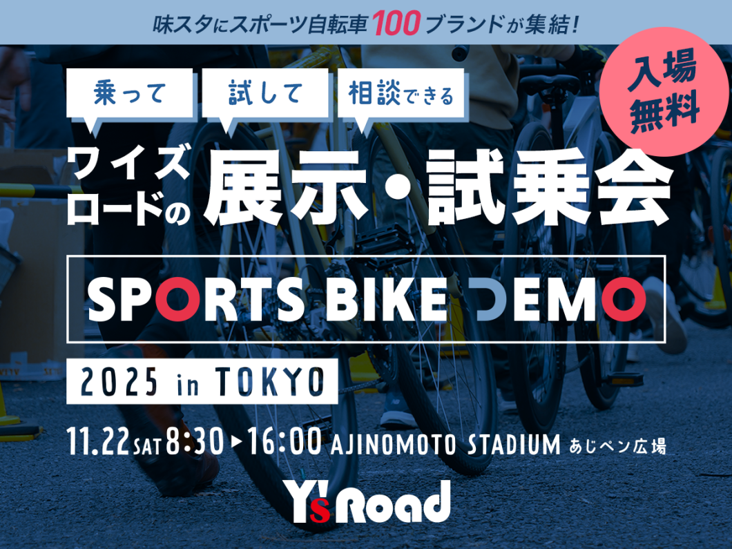 国内最大級のスポーツバイクイベント「ワイズロード スポーツバイクデモ」が今年も開催!完成車のみならず部品・用品・ウェアなど最新モデルの試乗や展示を見ることができるスポーツバイク好きにはたまらない一日です。都心からアクセスしやすい味の素スタジアム「あじペン広場」を会場として、100ブランド以上を集めて過去最大規模での開催となります。