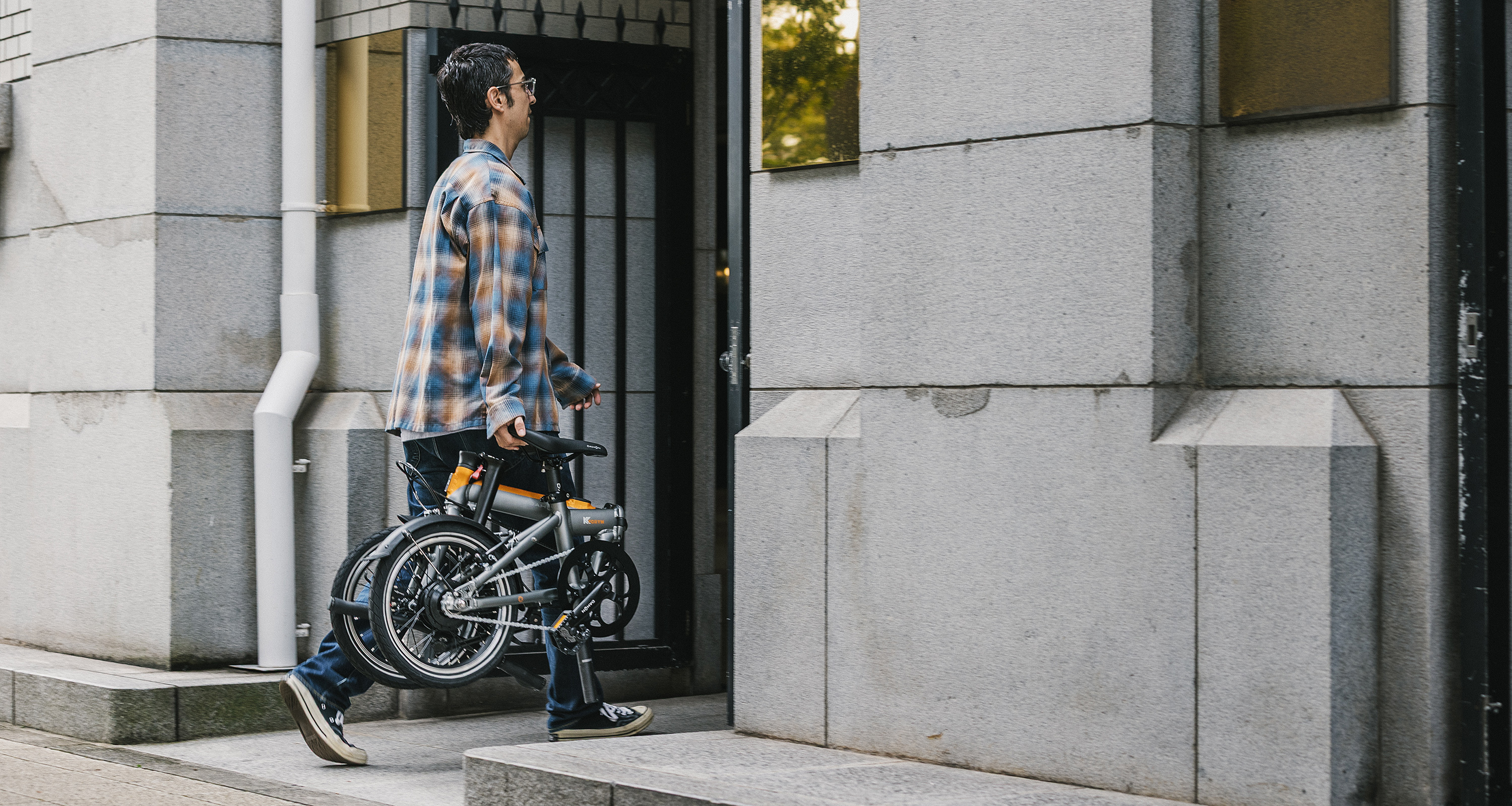 気軽に折りたためてコンパクトになるので、屋内保管すれば防犯や汚れ防止に便利。輪行袋に入れて公共交通機関で移動(輪行)し、遠出した先でサイクリングすることも。
