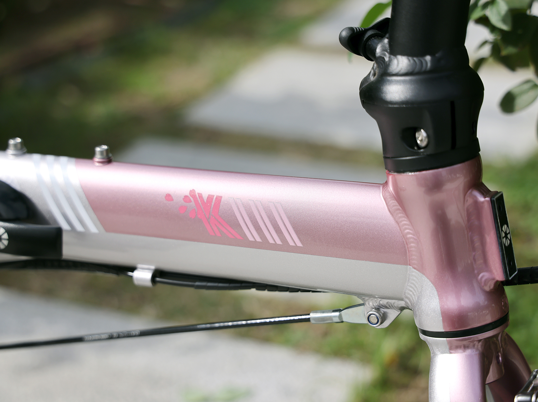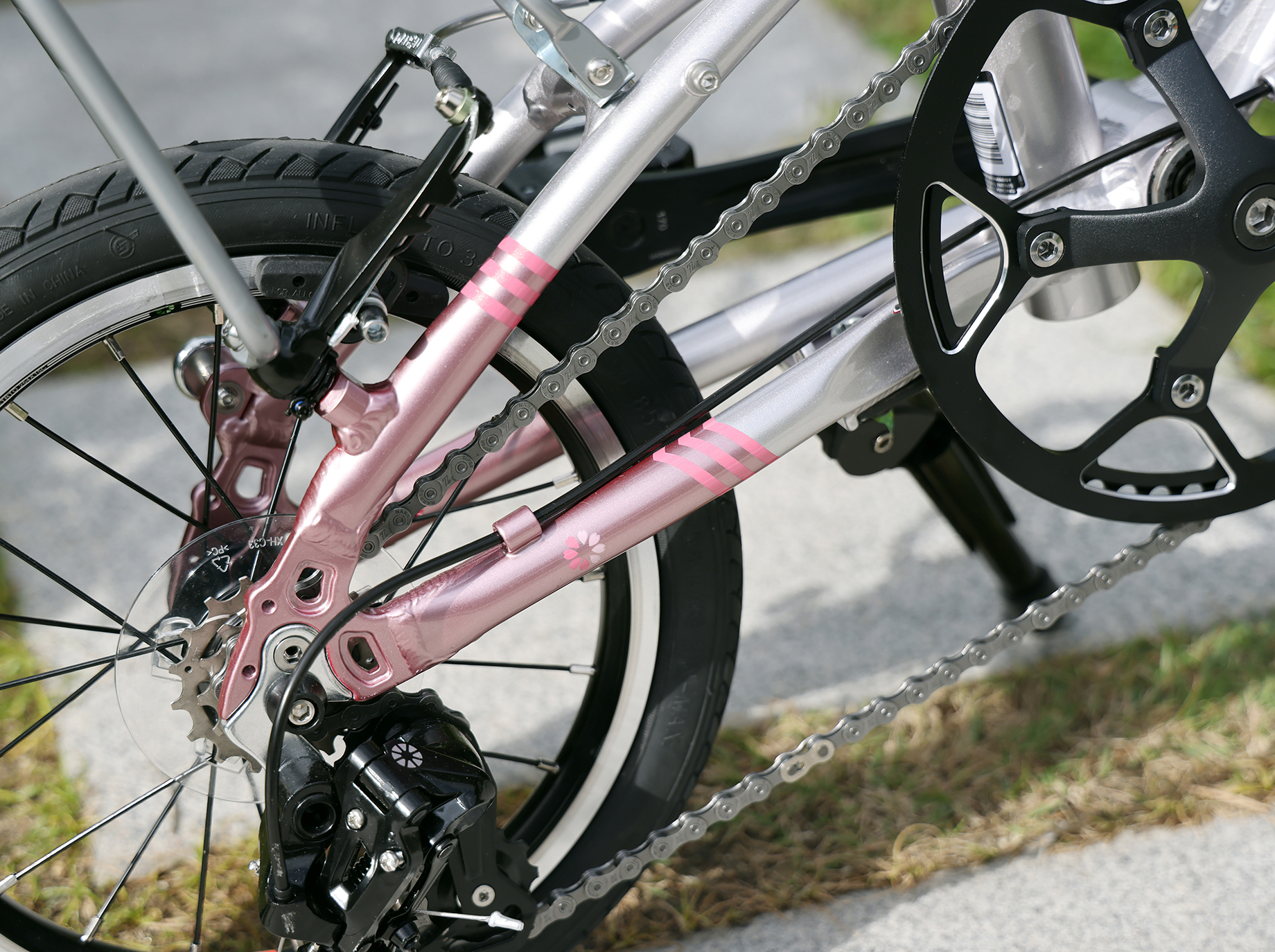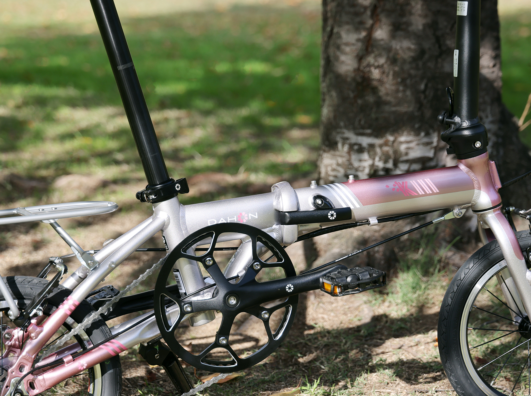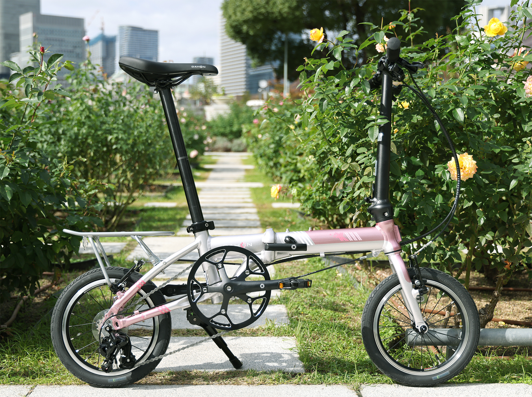 LIMITED MODEL こだわりの特別仕様モデルを限定リリース スペシャルな一台をあなたに K3 GRADE DETAILSグレード詳細 K3(ピュアリティーピンク) Weight 8.2 kg Wheel Size 14 inch Speeds 3 speed Folding Size W65 × H59 × D28cm PRICE カラー:ピュアリティーピンク 日本の春の象徴でもある桜。そのひとときの美しさを写し取った桜色が、ブラックで統一されたパーツに映え、高級感のある特別な1台に。 フレームのベースカラーにシルバーを採用し、そこに3数種の異なるピンクを組み合わせることで、より柔らかく上品な印象のカラーに仕上げています。また、DAHONロゴの「O」を花弁に見立てたグラフィックや、モデル名ロゴを彩るフローラルモチーフをプラスし、より特別感のある限定デザインへと進化しました。 *写真のリアラック、キックスタンドは標準では付属しません。 ¥111,100(税別 ¥101,000)