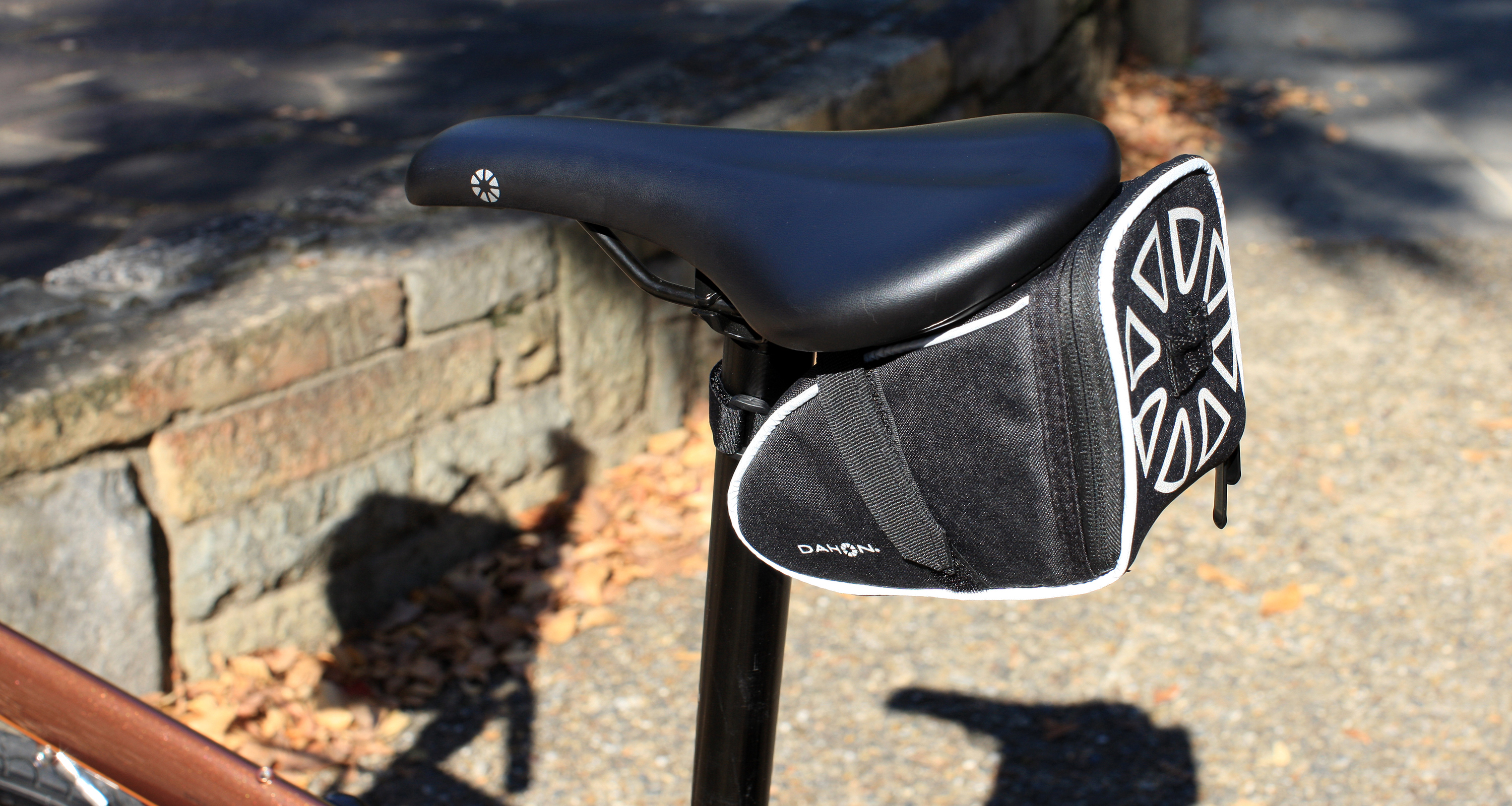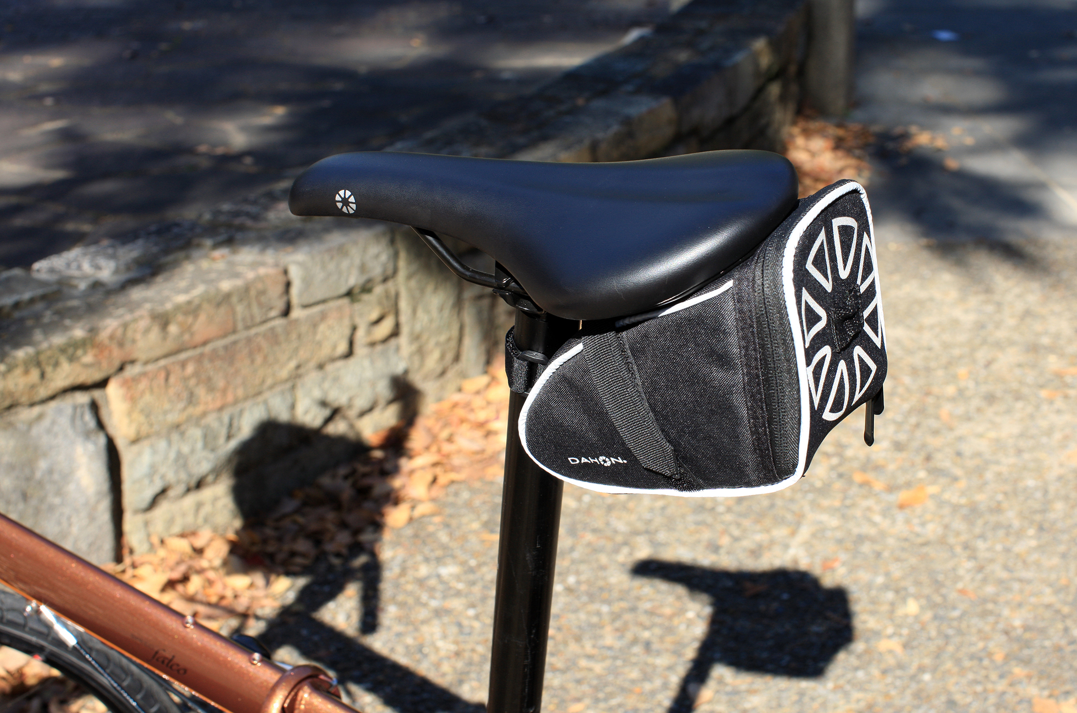 マジックテープ式のベルト3点でしっかり固定するタイプ。携帯工具やパンク修理キットを収納できます。背面ロゴはリフレクトデカールとなっていて、後方からの夜間の視認性も高くなっています。