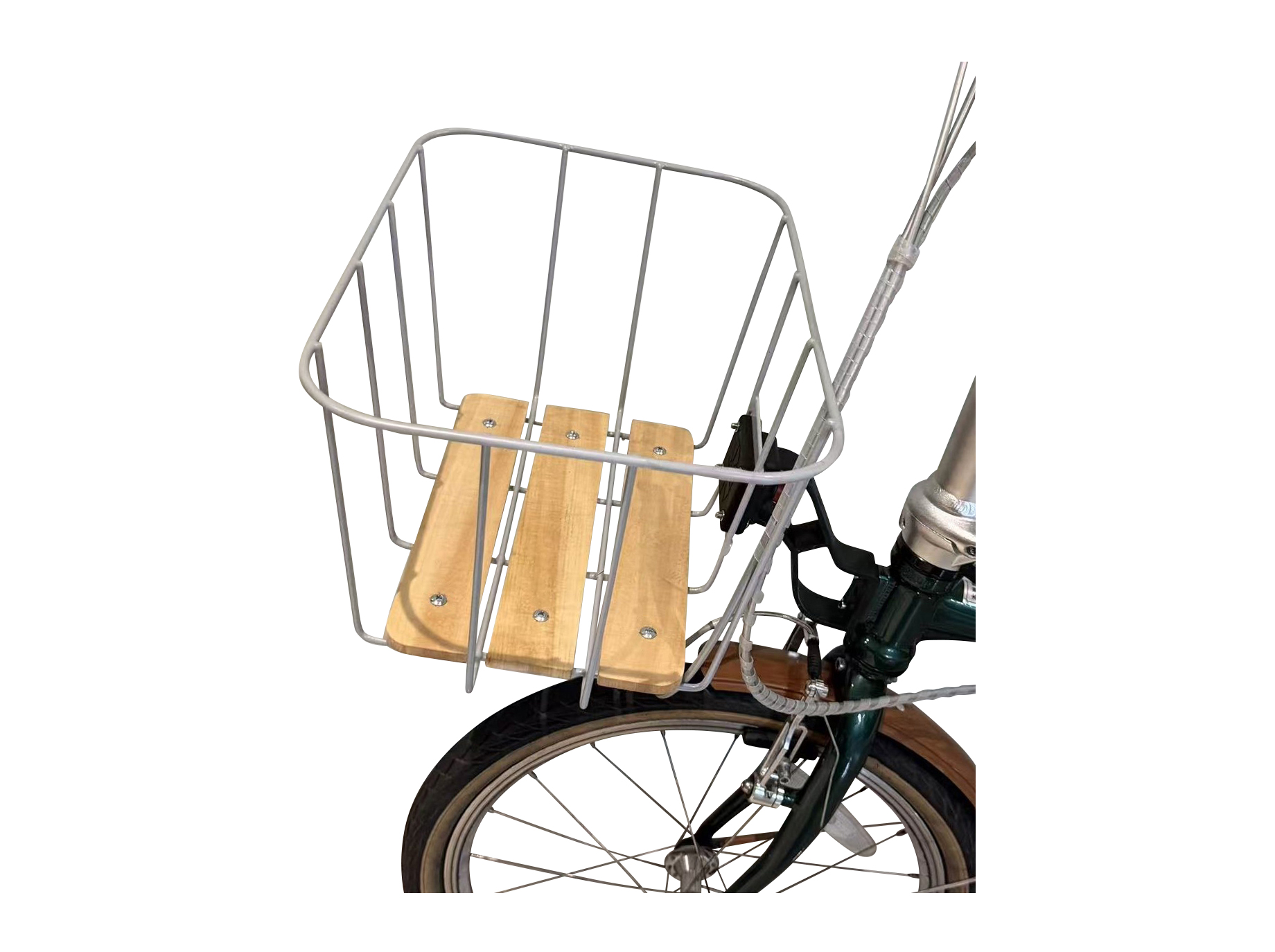 木製プレートのヘッドチューブ取付用ワイヤーバスケット。
