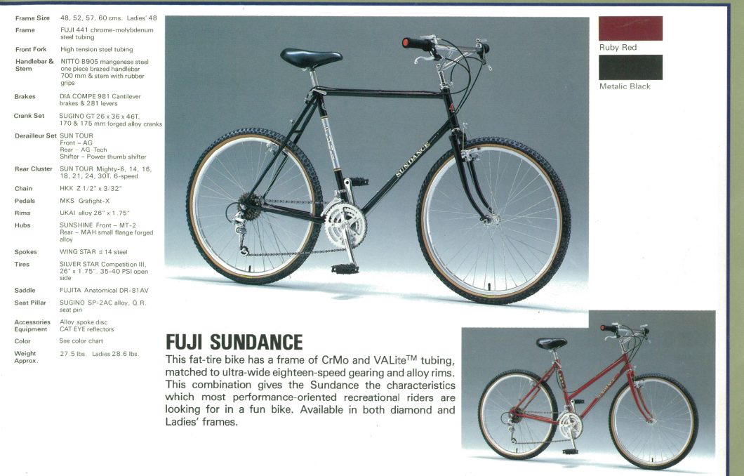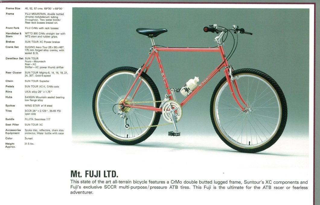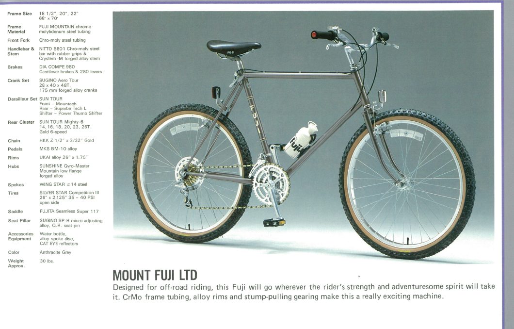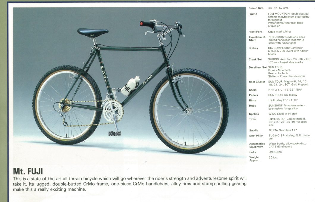 日本から米国へと海を渡り「総合自転車ブランド」として成長していた当時のFUJIも、やはり例外なくそんな時代背景を色濃く影響受けており、大胆にもモデル名にブランド名を冠した「Mt.FUJI」(1984)など、一部のショップで現在ビンテージフレームとして高価で取引されているような名作をいくつかリリースしていたんですね。