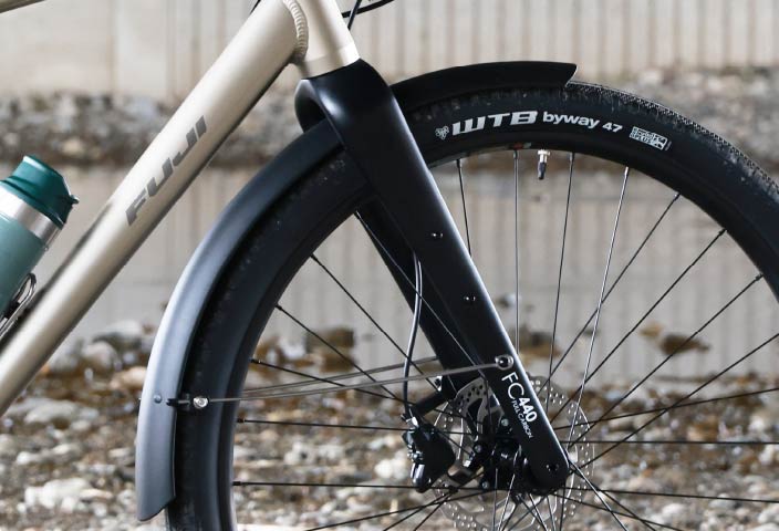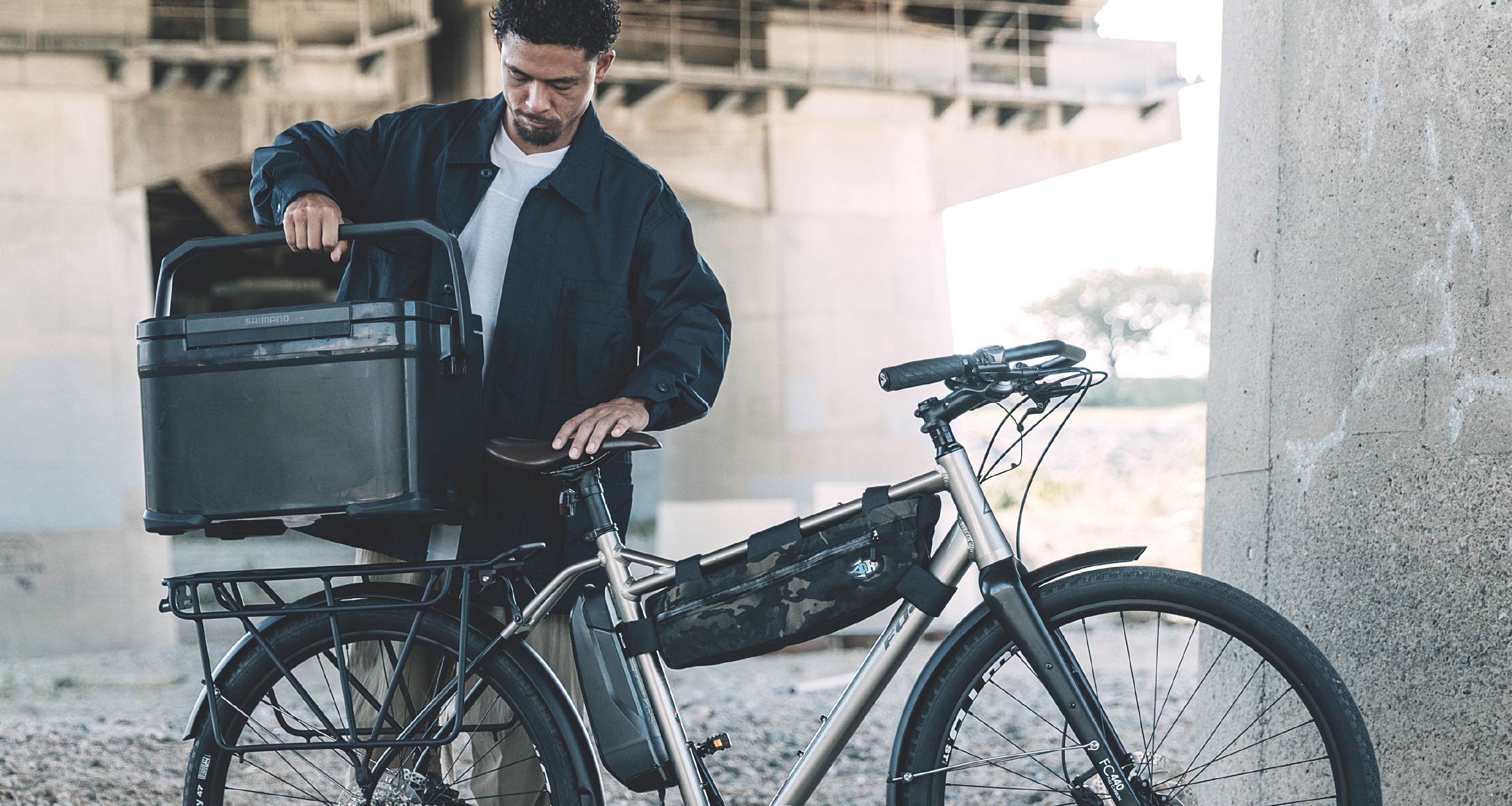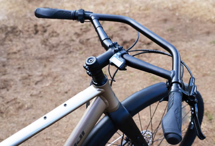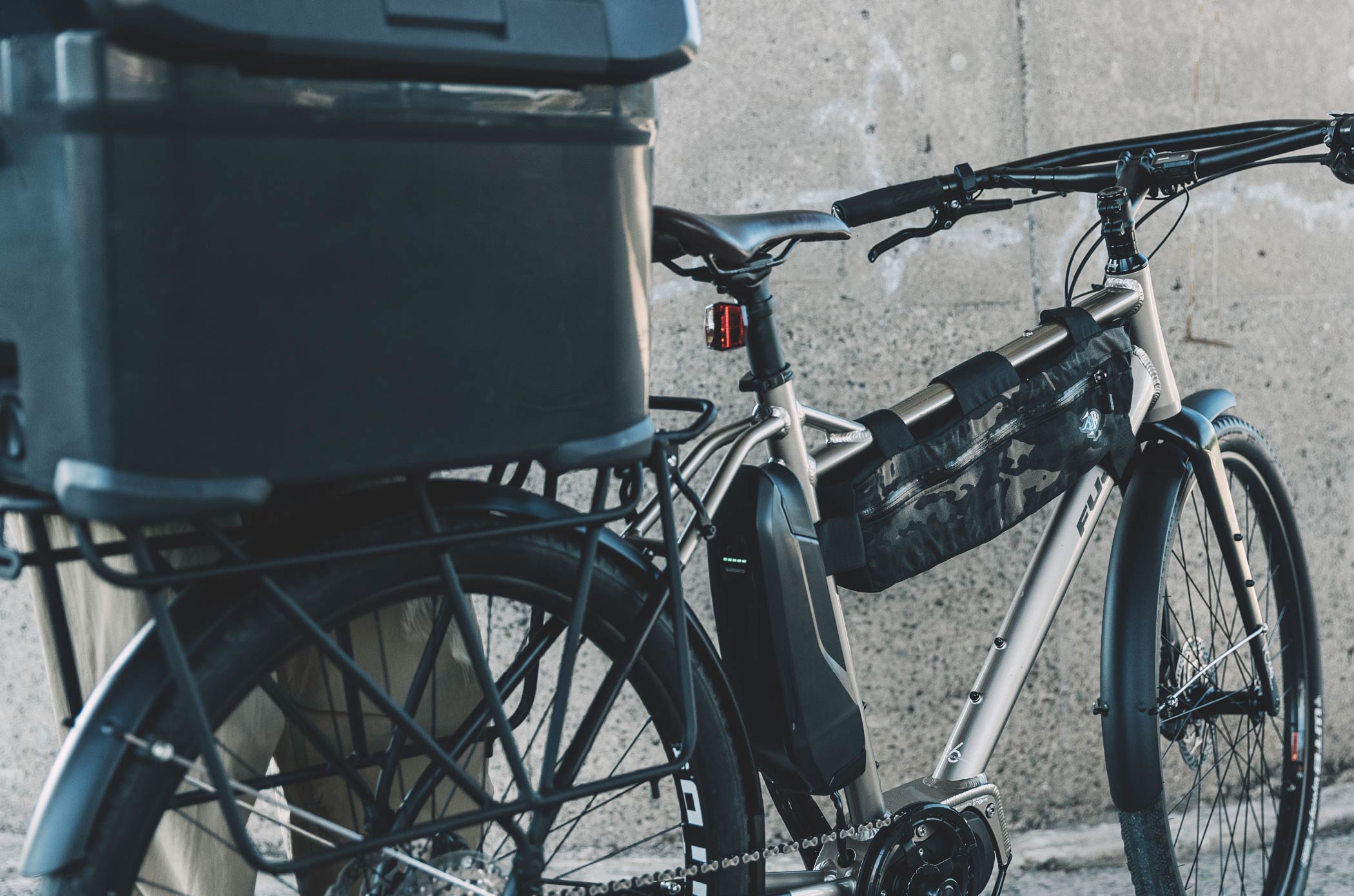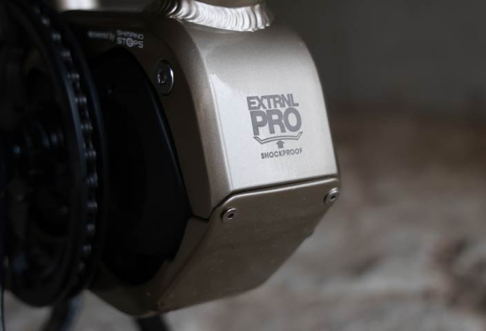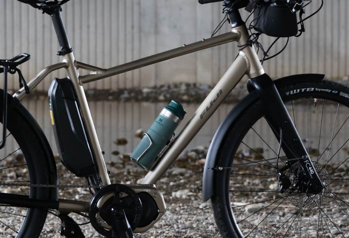 グラベルバイクとして名高いJARIのフレームをベースに設計されたグラベルE-bikeは、バッテリーをシートチューブ裏に設置することでフロントトライアングルの自由度が確保され、フレームバッグ装着の選択肢も多い。車体には最大で5つのボトルケージが装着可能で、やや長めに取られたリアセンターが高い直進安定性をもたらしているミッドテール設計は、専用リアキャリア(別売)を装着することにより更なる積載性が付与できる。ドライブユニットを保護するプロテクトステー「EXTRNL PRO」に加え、2024年モデルから新たにマルチポジションハンドルを採用したことで悪路/長距離走行も苦にならない。