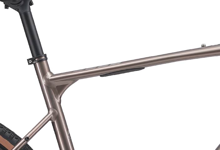 バイクパッキングでも走行不能なエリアに遭遇して長い距離を担ぐのも稀ではないので、2mmの厚さのシリコンパッドをトップチューブ下に標準装備してライダーの肩への負担の軽減を狙った。