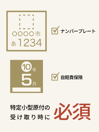 商品の受け取り時にはナンバープレートと自賠責保険加入が必須となります。そのため決定した受取予定日までにナンバープレートの発行と自賠責保険の加入手続きを注文者様にて行ってください。