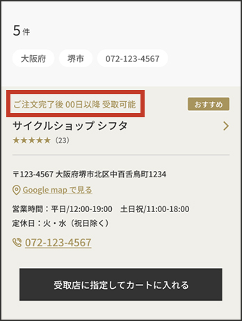 自転車をあんしんピックアップで購入する際の受取までのおよその日数は、受取店舗の選択時に各店舗情報の「ご注文完了後00日以降受取可能」と表示されます。