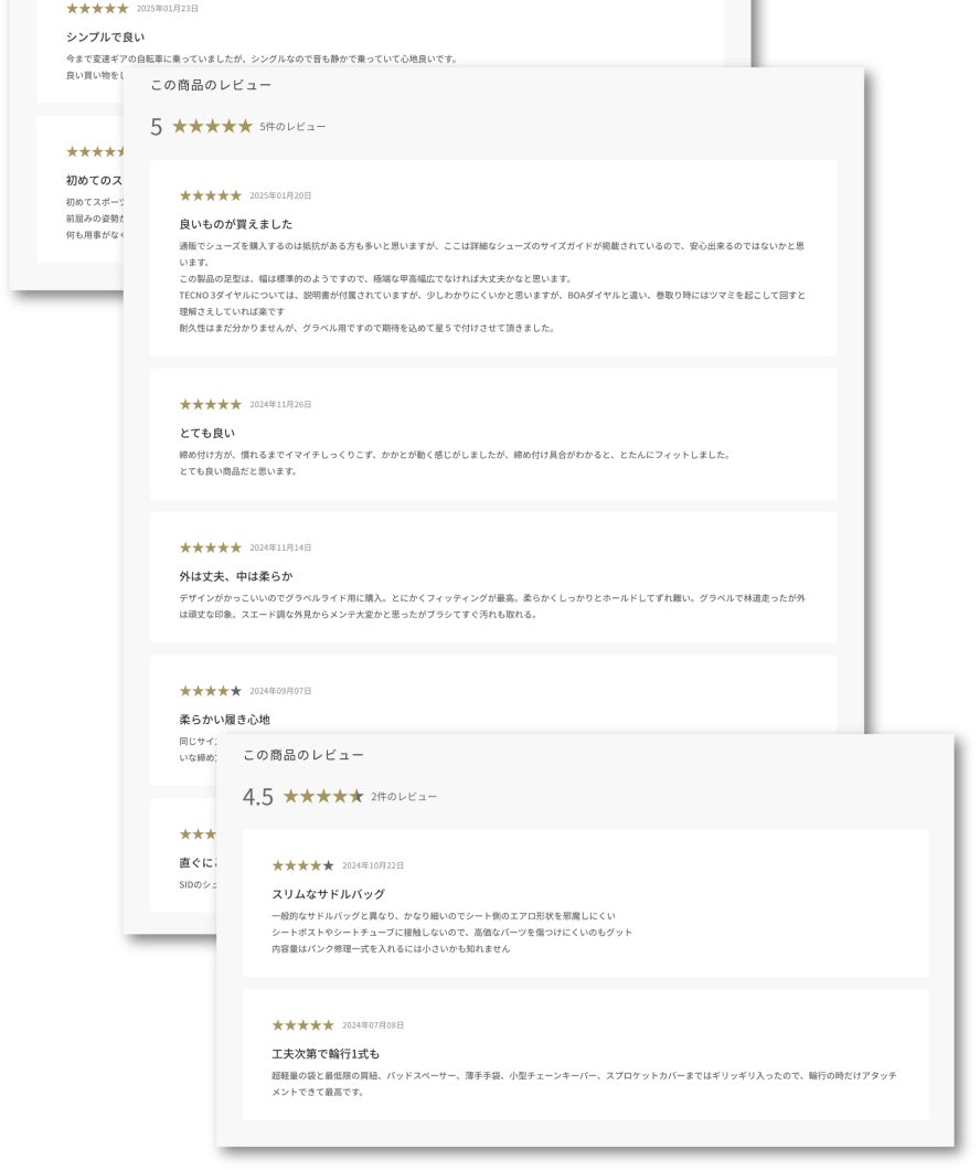 自分のお気に入りの自転車や関連アクセサリーなどがあれば、人にもその良さを伝えたいですよね!そんな情報をみんなでやり取りできれば素敵だな!と考え、このたび期間限定にはなりますが、レビューを投稿いただいた方にもれなくお得なクーポンをプレゼントするキャンペーンを実施いたします。