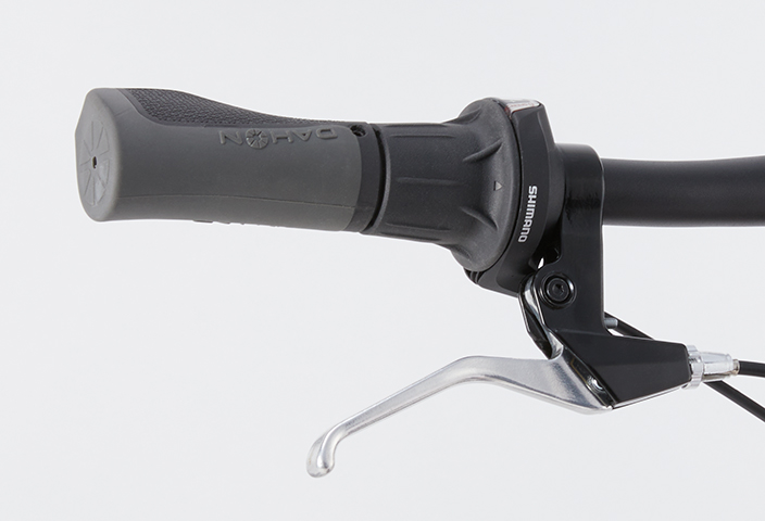 直観的に扱いやすいグリップ式シフターを採用。グリップは手の平にフィットしやすいエルゴタイプを装着しており快適な走行が楽しめる。