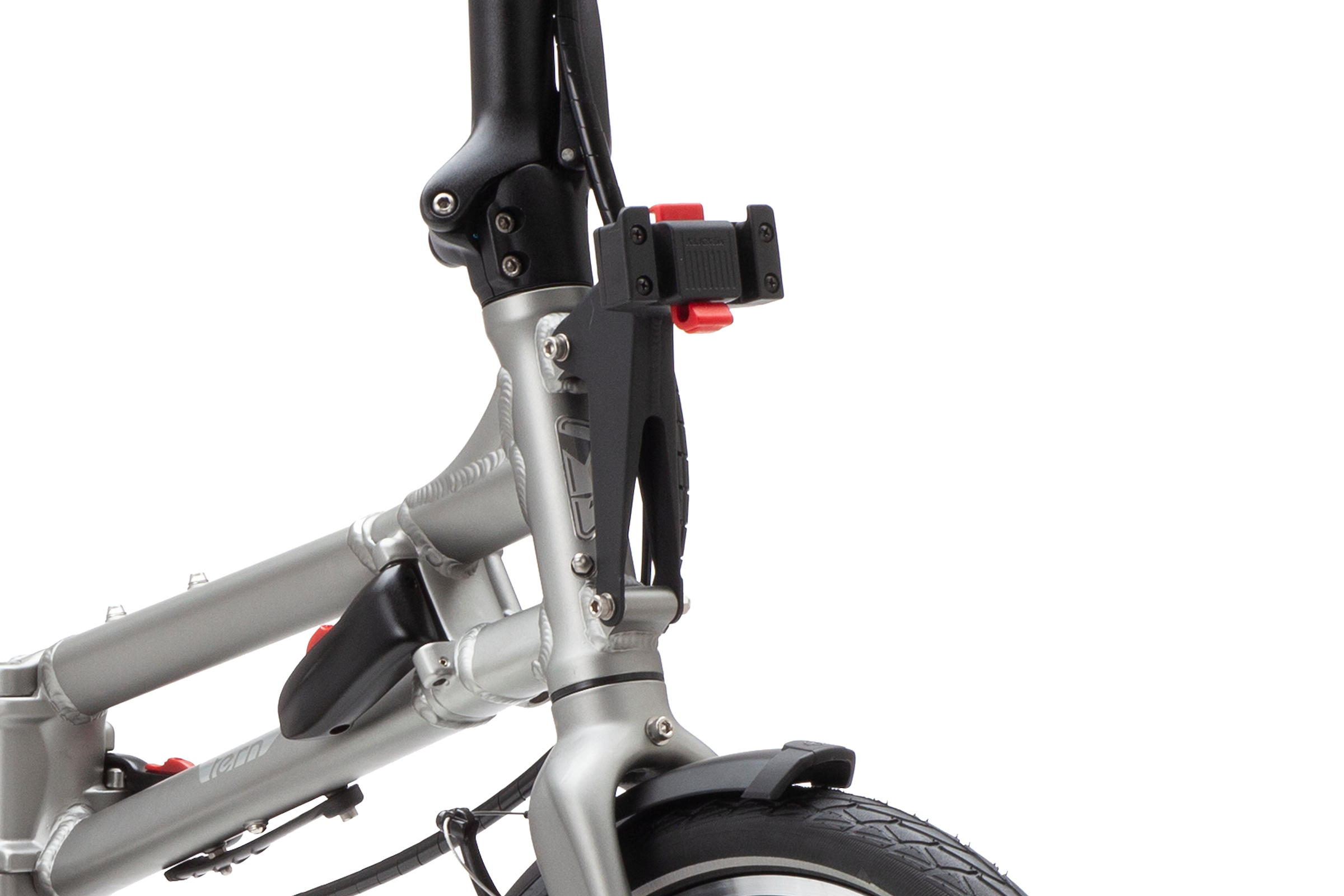フロントバスケットなどの取り付けはフォークに装着するものが多い中、フレームに直接取り付けることで走行時にバランスを崩しにくく、ハンドル操作がしやすくなる快適設計となっています。このブラケットはフレームにボルトでしっかり固定し、ここに取り付けるカゴなどはKLICKfix?対応によりワンタッチで脱着が可能で市販のアイテムも装着することができます。ワンタッチで脱着できるため盗難防止の鍵も付属されており保安面もしっかりカバーします。Luggage Truss CMTを装着した状態でも折りたたみに影響しないため本体の取り外しは不要です。