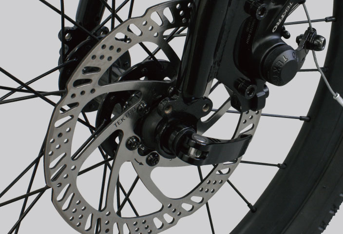 ワイヤーで動かすメカニカルディスクブレーキを搭載。悪天候でも制動力を発揮するブレーキシステ ムは、悪路だけでなく雨上がりの路面での走行時も威力を発揮します。