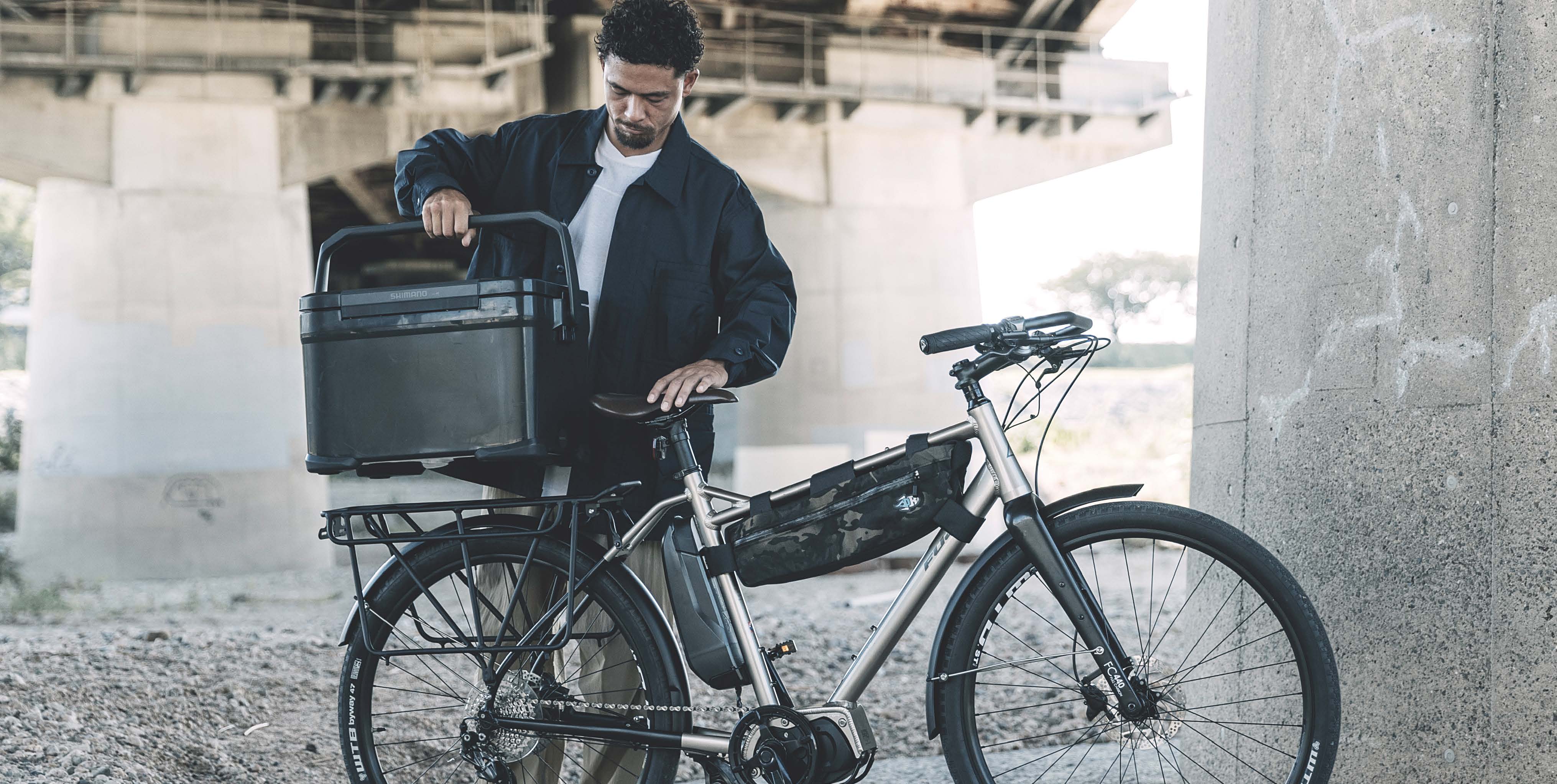グラベルバイクとして名高いJARIのフレームをベースに設計されたグラベルE-bikeは、バッテリーをシートチューブ裏に設置することでフロントトライアングルの自由度が確保され、フレームバッグ装着の選択肢も多い。車体には最大で5つのボトルケージが装着可能で、やや長めに取られたリアセンターが高い直進安定性をもたらしているミッドテール設計は、専用リアキャリア(別売)を装着することにより更なる積載性が付与できる。ドライブユニットを保護するプロテクトステー「EXTRNL PRO」に加え、2024年モデルから新たにマルチポジションハンドルを採用したことで悪路/長距離走行も苦にならない。