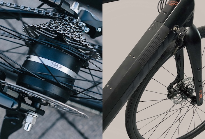 Bafang製のコンパクトなリアハブモーターにダウンチューブ内蔵式のバッテリーを採用し、E-BIKEに見えないスタイルを実現。