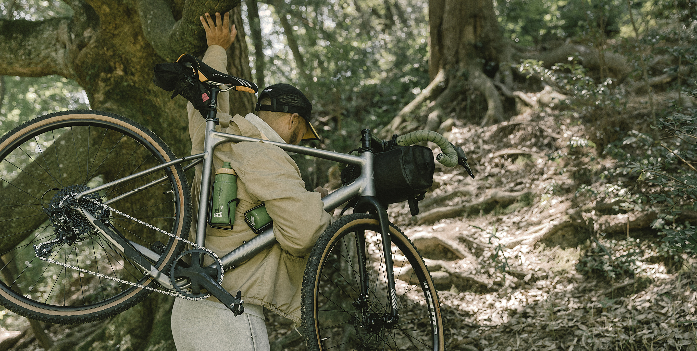 日本語の「砂利」からインスパイアされたその名の通り、悪路すら自分のフィールドに変えることができる自転車をイメージし開発されたアドベンチャーロード「ジャリ」。様々な用途に柔軟に対応出来るマルチパーパスバイクということもあって、我々の間ではこのバイクをスイスアーミーナイフ(十徳ナイフ)とも呼んでいる。製品化するまでには6種類のプロトタイプを試作し、フィールドテストによって様々なアイデアとアップデートを詰め込んだ。ショルダーパッドについてはトレイルに入った際に走行不可能なエリアに差しかかって、バイクを担いで長い距離を歩いた時に思いついた。BENTO BOXマウントについてはボルトオンタイプとなっている。BBスペックはメンテナンス性の高さや多くのショップが常備しているであろうパーツということで、緊急時の問題解決がしやすいBSAを最終的に選択。積載性を重視し選び抜かれたアルミ素材は、同素材の中で重量こそ平均的なものの、絶対の信頼のおける高い強度を実現した。同シリーズのハンドルには、全てこのバイクのために特別に作られたOVALのアドベンチャーバーを採用。ライダーの手首の角度を最適化しドロップ部分をより有効的にする為に一般的なロードタイプより20mm幅が広く、125mmドロップ、4度バックスウィープ、25度アウトスウィープ仕様となっており未舗装路でのバイクコントロール性が向上した。また、ロングホイールベースと低いBB位置による低重心の設計は「高速巡航性の高さ」という副産物をもたらした。フレームのリアセンターが長いこともあり加速性能は平均的だが、高速域での速度キープが非常に容易で、直進安定性も高いのでシビアなバイクコントロールを必要としないのも長時間走行には大きなメリットと言えるだろう。