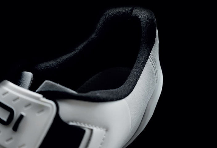 ヌバック調のマイクロファイバーライニングが、やさしく足を包み込む。長時間のライドでもムレにくく、快適