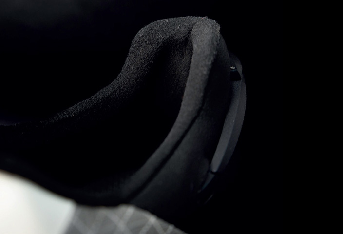 ヌバック調のマイクロファイバーライニングが、やさしく足を包み込む。長時間のライドでもムレにくく快適。