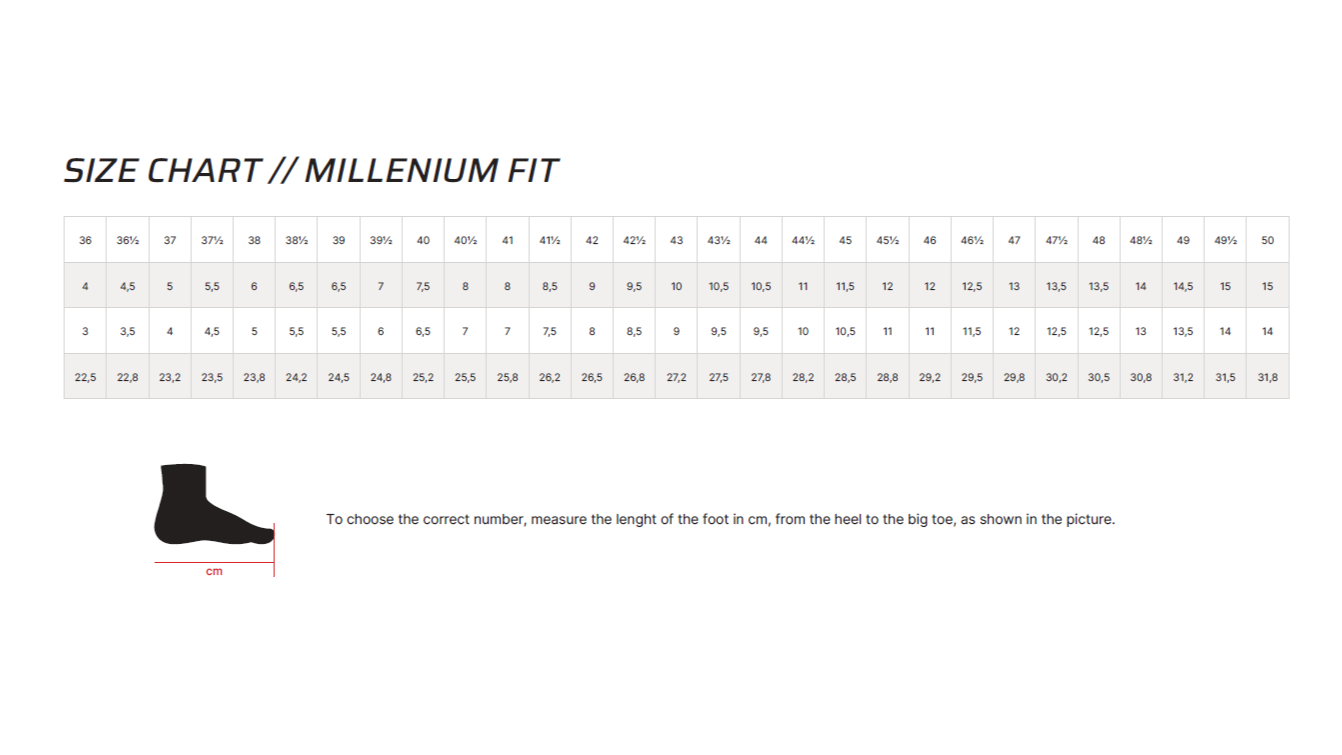 ミレニアムフィットは、SS25サイクリング・シューズの最新規格であり、この規格は指先にかけて、やや幅広のシェイプが特徴、より快適なフィット感を提供する。 ※SIDIレギュラーフィット サイズ42は、ミレニアムフィットのサイズ41.5に相当します。