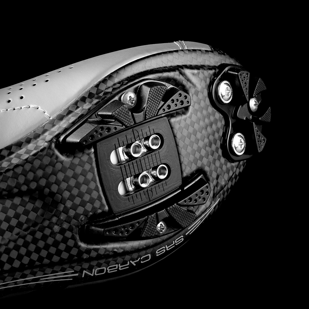 最新世代のカーボン製ソールで、中足骨部分の特殊な形状により、ペダルへのパワー伝達性が向上し、理想的なサポート形状へと進化しました。SRS(ソール交換システム)インサートを備え、交換可能なパーツはペダルの接触などでダメージを受けやすいカーボン部分を保護しています。 ナイロンとTPUからなるSRS(ソール交換システム)インサートを備え、交換可能なパーツは歩行時にダメージを受けやすいカーボン部分を保護しています。