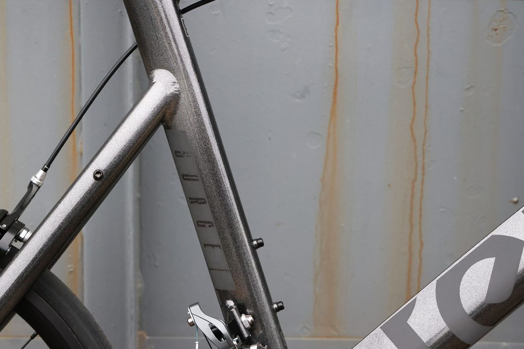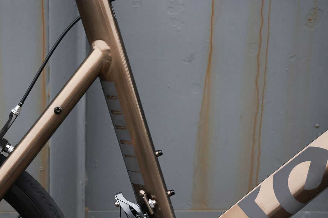 ギラリと輝くラメ感の強いシルバーカラーは、SURGEがもつエアロ形状のダウンチューブの美しさをより一層際立たせた高級感溢れる注目の一台です。