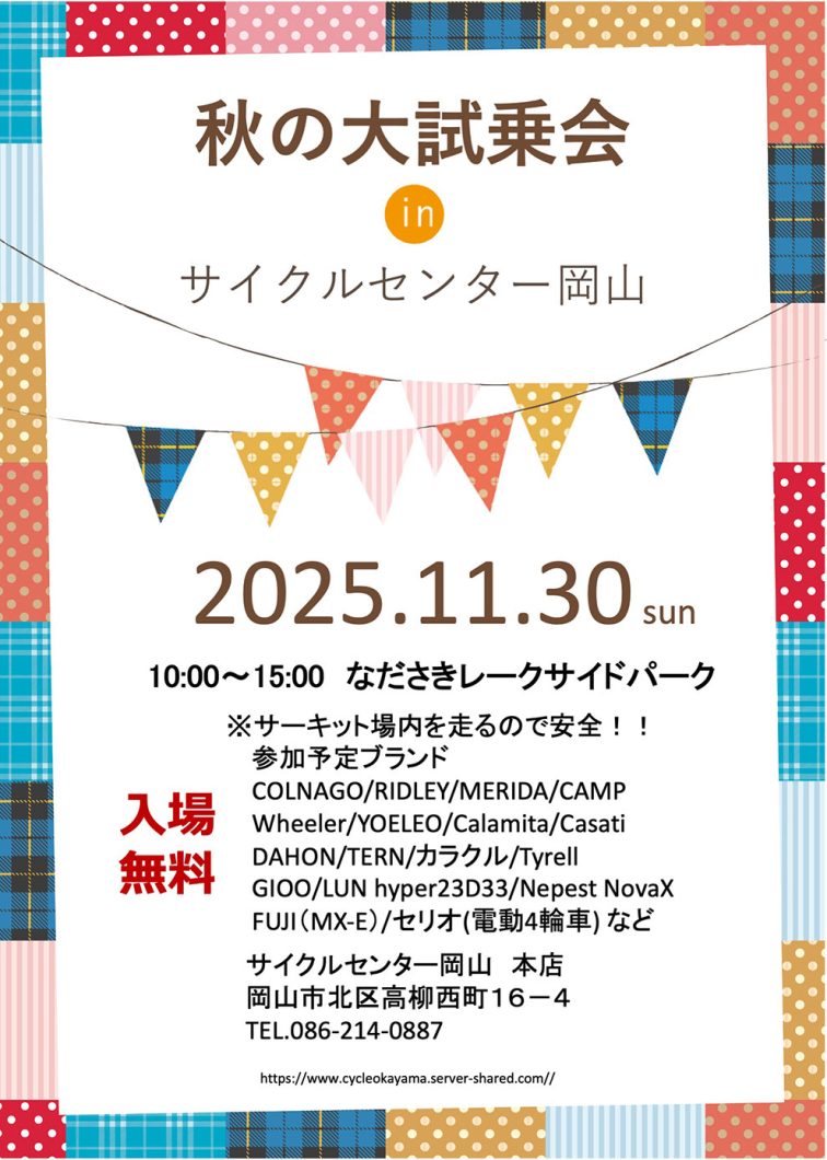 2025年11月30日(日)、岡山県岡山市のなださきレークサイドパークにて、サイクルセンター岡山本店 秋の大試乗会を開催。当日はTern製品の試乗会も実施いたします。