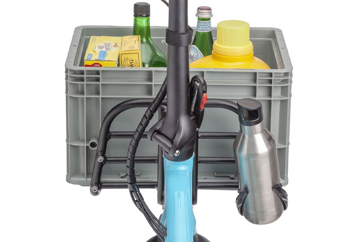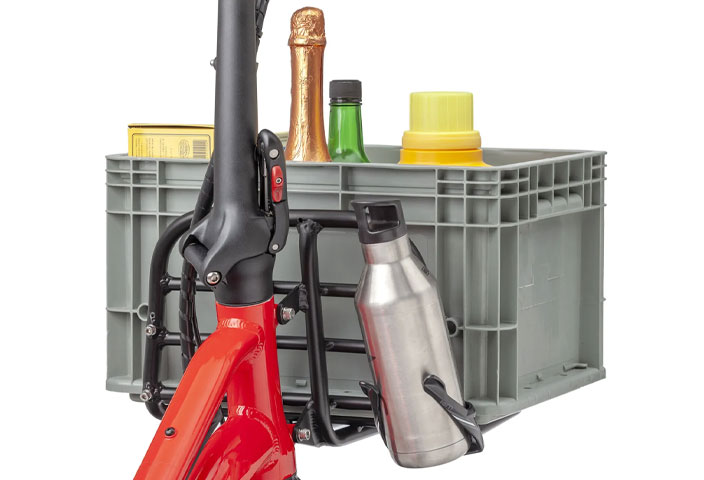 フレームマウント式で、最大20kgまでの運搬が可能です。 操縦性を妨げず、たくさんの荷物を運ぶのに十分な大きさで、大きな箱からバッグまで様々な荷物を運ぶことができます。 木箱やコンテナーの取り付けに最適な4つの取り付け穴を装備しており、リア用ボトルケージマウントも2個付いています。
