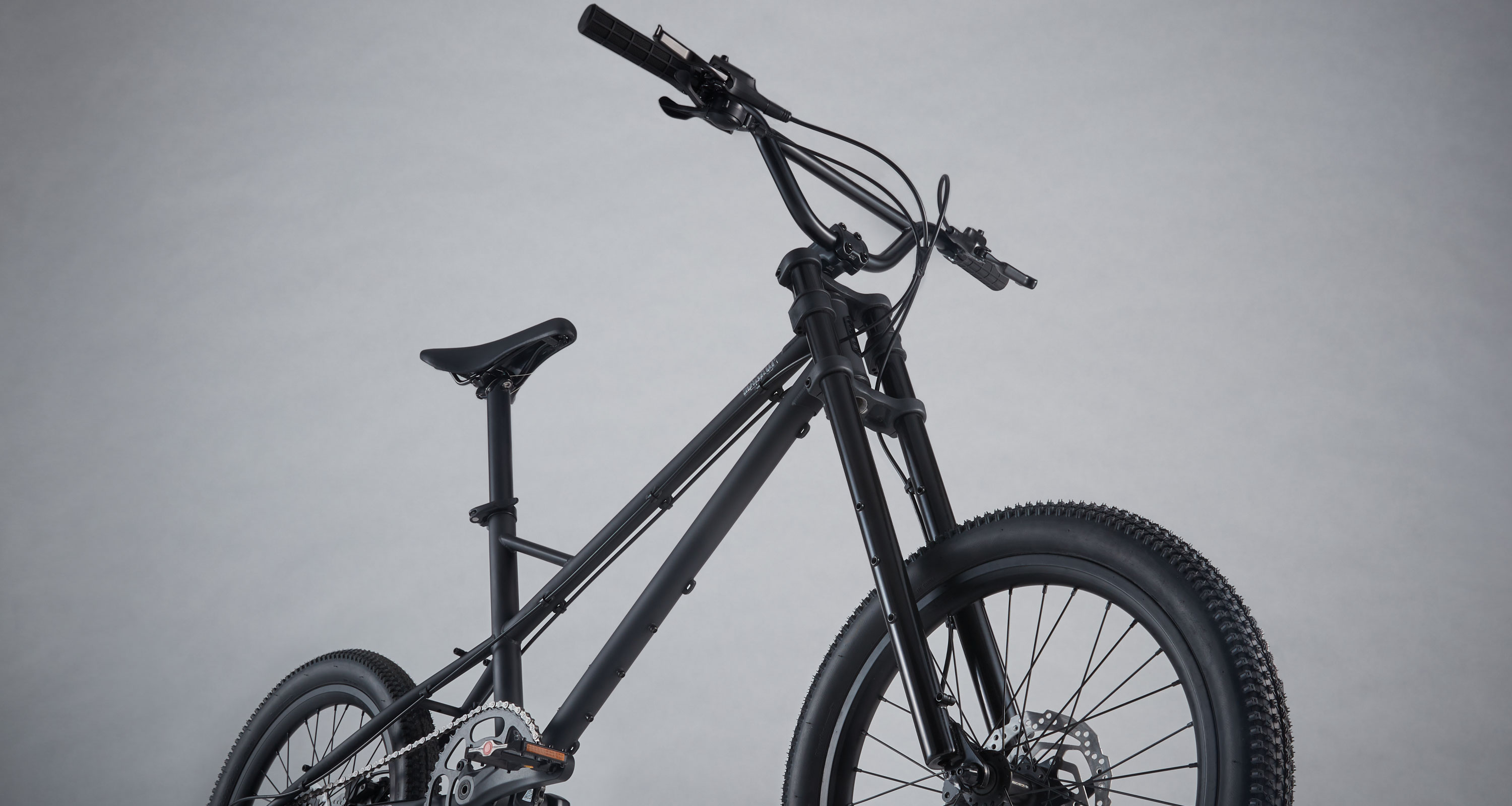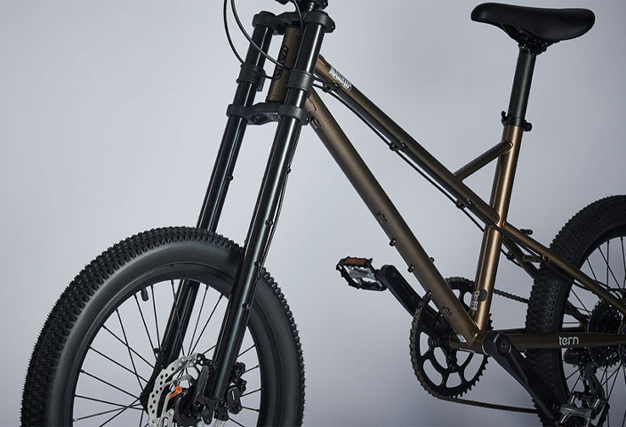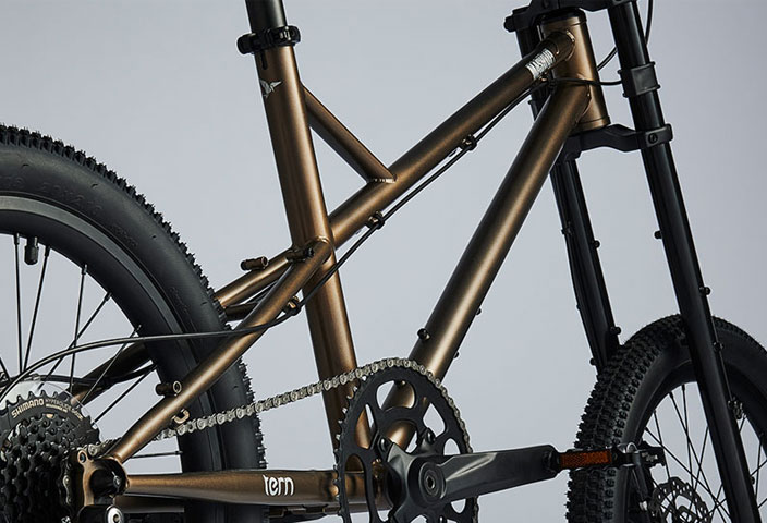 MTBスタイルのタフなクロモリフレームを採用。高いヘッド位置から一直線に下るMTB譲りのフレームワークがソリッドで剛健な新世代ミニベロフレーム。広い身長域をカバーする1サイズ設計。ドロッパーシートポストに対応し、随所にダボを配し拡張性も充実。