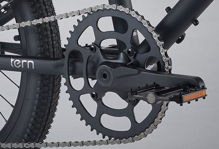 52Tナローワイド 4アームクランクセットを搭載。MTB規格の73mmBBとPCD104の4アーム式クランクに52Tの大径ナローワイドチェーンリングを組み合わせ、ミニベロらしからぬ踏み応えと高速巡航性能を生み出すパワフルな駆動系を採用。
